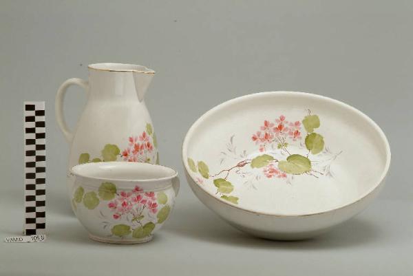- NOTIZIE STORICO CRITICHE Il catino lavamano, appartenente ad un servizio da camera (nn. inv. 644-646), è decorato a mano con motivo floreale policromo eseguito soprasmalto. La foggia ancora classica dell'oggetto in esame e il confronto stilistico con ciotole da colazione, prodotte in serie dalla Società Ceramica Italiana, conservate nel museo contrassegnate da nomi propri e da un decoro floreale simile fanno ipotizzare una datazione tra gli anni '20 e '30 del Novecento. Il marchio presente sul fondo fu in uso indicativamente dal 1883 al 1960 e fu impresso solo sulle terraglie prodotte nello stabilimento di San Cristoforo.
