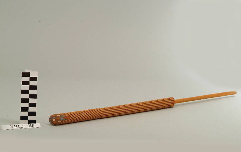 Scultura dalla forma allungata con scanalature composta da due parti fatte in materiali diversi; fondo color rosso con inserti colorati.