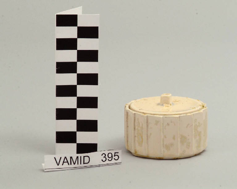 Scatola di forma circolare con motivo a coste verticali a rilievo; coperchio circolare con pomolo apicale; fondo uniforme color avorio.