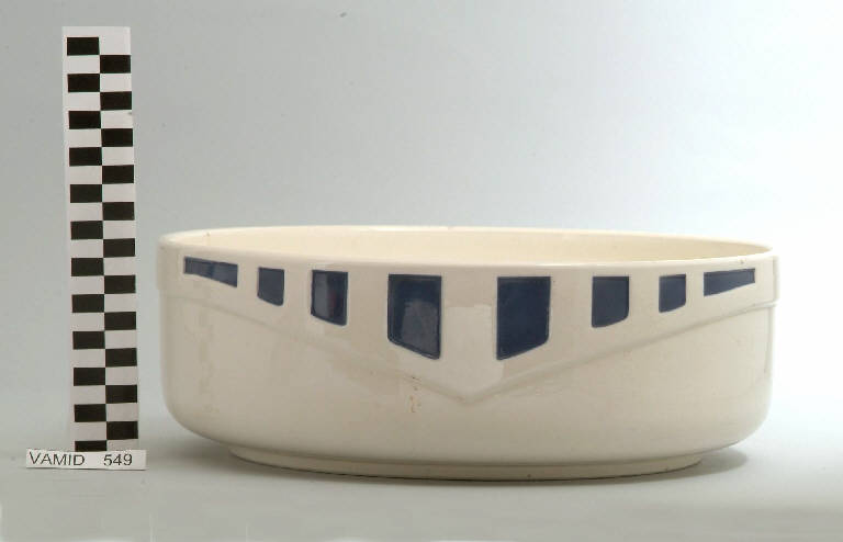 Catino lavamano circolare; fondo bianco con motivo decorativo geometrico a riquadri blu in rilievo.