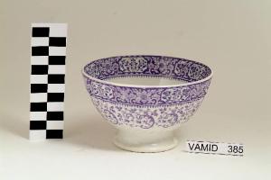Ciotola a sezione circolare con piede arrotondato; fondo bianco con motivo decorativo vegetale in viola all'esterno e all'interno.