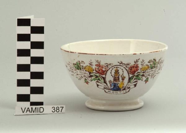 Ciotola a sezione circolare con piede arrotondato; fondo bianco decorato all'esterno con l'immagine della Madonna di Oropa e motivi decorativi floreali in marrone, azzurro, giallo e arancio; bordo rifinito con filettatura oro.