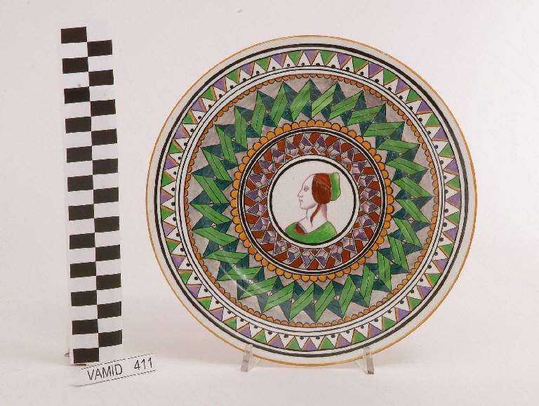 Piatto circolare; fondo bianco con volto di dama in marrone, verde e rosa nel centro del cavetto e motivi decorativi geometrici in giallo, verde, viola e marrone lungo l'ala.