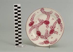 Piatto circolare; fondo bianco con motivo vegetale (foglie e margherite) in bordeaux; bordo rifinito in bordeaux.
