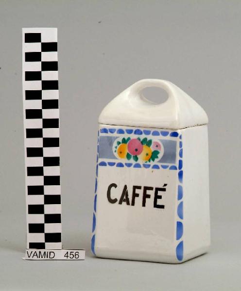 Barattolo portacaffè di forma parallelepipeda con coperchio; fondo bianco con motivo decorativo vegetale in blu, verde, rosa e giallo e scritta "CAFFE'" in nero.