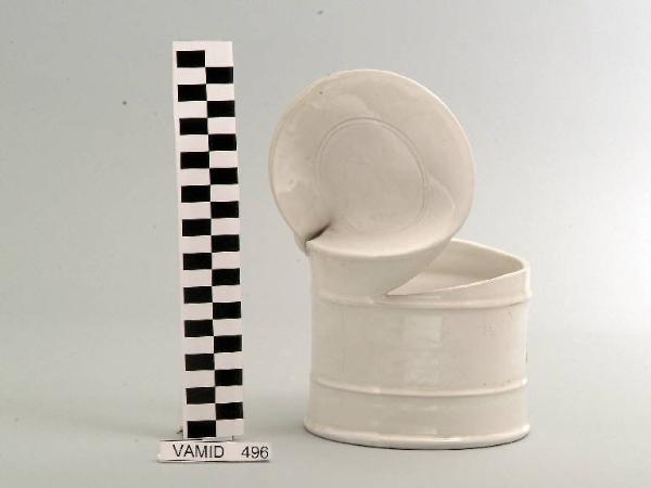 Scultura a forma di scatola cilindrica aperta; fondo bianco uniforme.