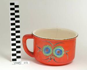 Pitale cilindrico con manico liscio; fondo arancio con motivi decorativi astratti in nero, blu, verde e marrone; bordo rifinito in nero.