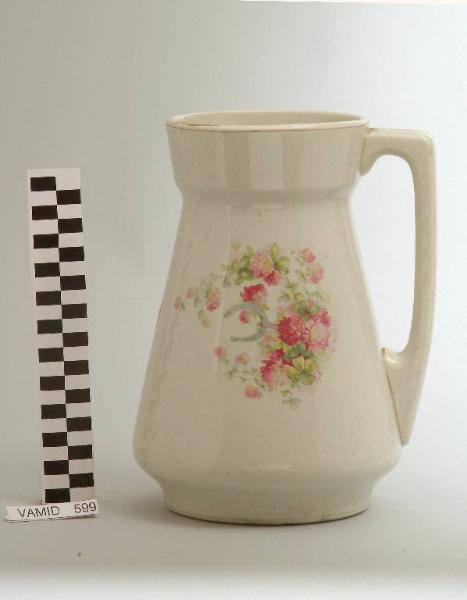 Brocca con manico squadrato; fondo color avorio con motivo floreale e ferro di cavallo in rosa, verde e grigio all'esterno; bordo superiore rifinito con filettatura oro.