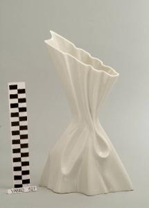 Vaso dalla forma irregolare con piegature e restringimento al centro; fondo di colore bianco lucido.