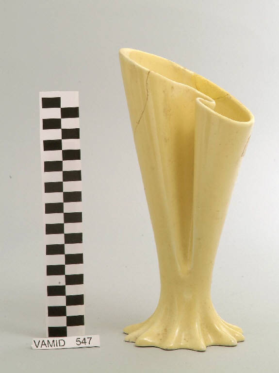 Vaso dalla forma irregolare con piede ondulato; fondo giallo chiaro lucido uniforme.