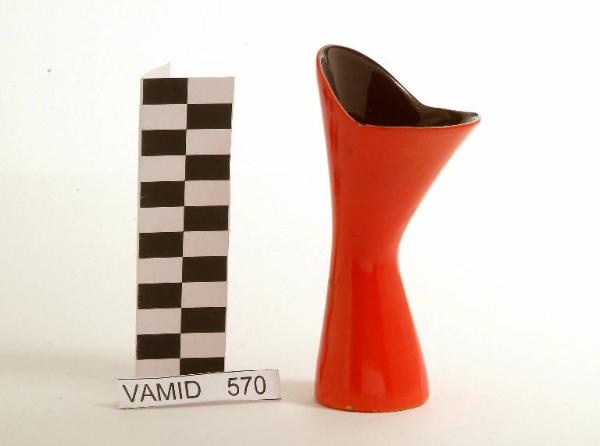 Vaso di forma irregolare; piede circolare; imboccatura svasata; fondo arancio; marrone internamente.
