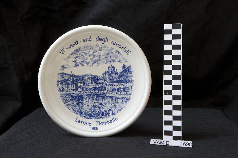 Piatto circolare privo di tesa; bordo rialzato; fondo bianco con veduta di Laveno Mombello dal lago in blu.