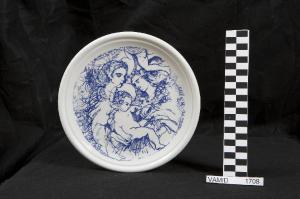 Piatto circolare privo di tesa; fondo bianco con scena sacra in blu.