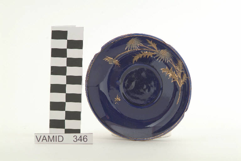 Piattino circolare; decoro con disegni floreali in argento e oro su fondo blu cobalto; bordo rifinito con filettatura oro.