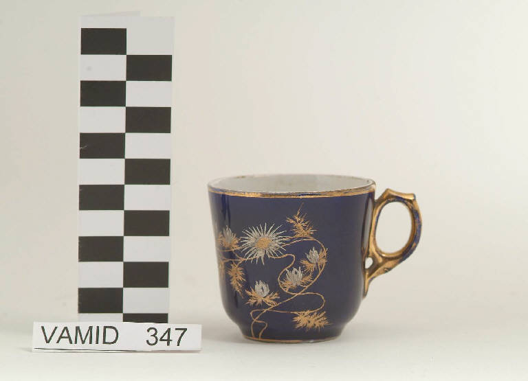 Tazza da caffè con corpo leggermente svasato; restringimento in prossimità del piede; manico ovale con profilo esterno mistilineo; decoro con disegni floreali in argento e oro su fondo blu cobalto; bordi e manico in oro; bianco internamente.