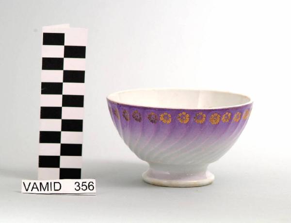 Ciotola a costolature trasversali, decorata al bordo superiore con motivi floreali con transfer oro su fondo a smalto viola sfumato; bordo rifinito con filettatura oro.