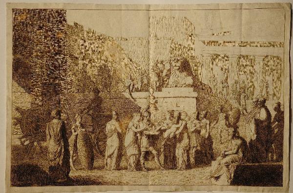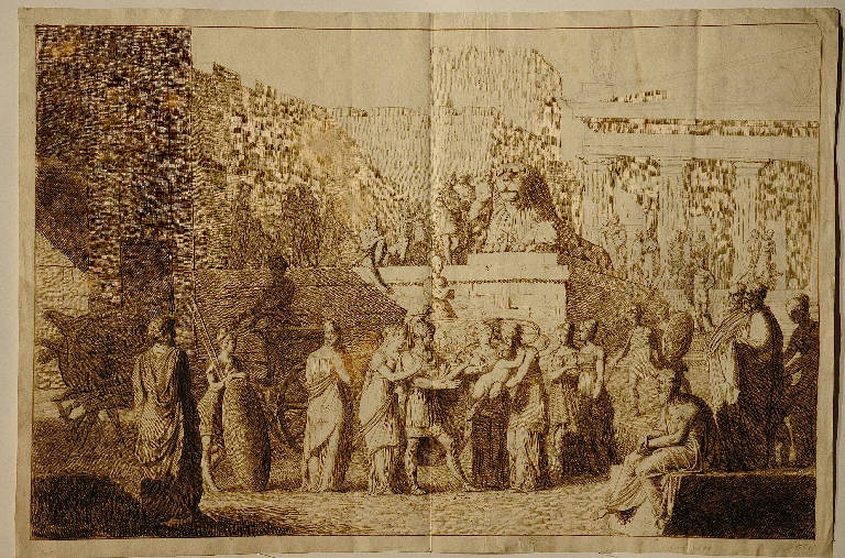 - NOTIZIE STORICO CRITICHE La datazione è indicata in riferimento agli affreschi con scene dell'Iliade nel palazzo Trento-Papafava di Padova di De Min. Realizzati tra il 1818 e il 1820 (Lucco 1990), nel periodo giovanile, questi affreschi raffigurano "Ettore innanzi a Elena incita Paride" e "Nestore prega Diomede di abbandonare il combattimento" (v. Paludetti 1959, tavv. 9 e 10); si può ipotizzare che il presente disegno sia uno studio per un affresco del ciclo, poi non eseguito. Si riscontrano analogie tra il disegno e gli affreschi nella resa delle figure in atteggiamenti quieti, contemplativi e nell'impianto teatrale solenne delle architetture. Astianatte è tratto, in controparte, dal bambino della Madonna Bridgewater di Raffaello, del quale l'autore conobbe probabilmente una stampa, essendo il dipinto (fino al 1792 nella collezione Orléans) in una collezione privata inglese. Il tratteggio verticale regolare con cui sono rese le ombre delle architetture si ritrova nel disegno "Merope cerca di uccidere il figlio Epito" del Museo Civico di Padova, datato 1817 (Da Giovanni De Min, 2005, fig. 8)