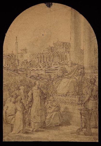 - NOTIZIE STORICO CRITICHE La data post quem è stabilita tenendo conto della data impressa sulla filigrana e ben leggibile in controluce. La data ante quem tiene conto del fatto che compisizioni di soggetti storico-religiosi di questo tipo sono ricorrenti nella seconda metà dell'ottocento presso gli artisti che fanno capo all'insegnamento di Enrico Scuri, successore di Dotti all'Accademia Carrara dal 1846 al 1884. L'annerimento sul verso e, sul recto, il tratto del contorno delle figure ripetuto in modo secco indicano che il disegno è stato riportato a ricalco su un altro foglio, forse usato per un'incisione.\nDue foto di questo disegno si trovano nell'album D5 di Riccardo Lampugnani, incollate sopra a una foto di un altro disegno che reca impressa la data "Feb 69", fatto che permette di ipotizzare che l'acquisto del disegno qui catalogato sia avvenuto posteriormente al 1969.