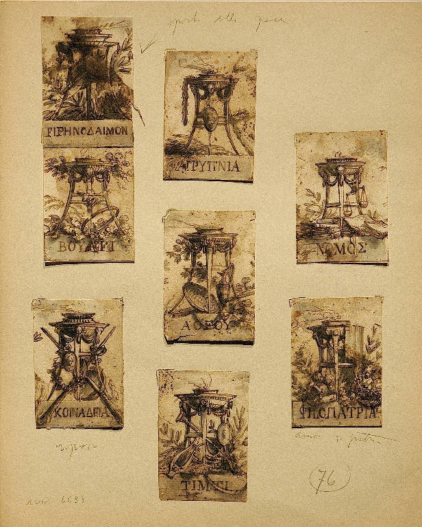 - NOTIZIE STORICO CRITICHE Le misure riportate nelle presente scheda e le iscrizioni si riferiscono a ognuno degli otto frammenti, ritagliati appunto nelle stesse dimensioni seguendo la "cornice" tracciata a penna attorno a ciascun disegno. Si tratta di piccoli studi intesi probabilmente a essere incisi a corredo di testi di contenuto patriottico o giuridico, eseguiti forse nell'ambito di Giovanbattista Bodoni, che manifestò interesse per la stampa di caratteri tipografici greci (stampando nel 1784 le Odi di Anacreonte, senza alcun decoro figurativo); non compaiono incisioni analoghe, per l'impostazione del soggetto, a questi studi nel repertorio delle stampe ordinate e utilizzate da Bodoni "Raccolta di rami incisi..." (Biblioteca Nazionale Braidense, Fondo Bodoni), ma lo stile e il tipo di cultura antiquaria presenti in questi frammenti corrispondono con la cultura artistica parmense degli anni in cui furono attivi, per Bodoni, allievi di Petitot come Domenico Muzzi o Evangelista Ferrari.