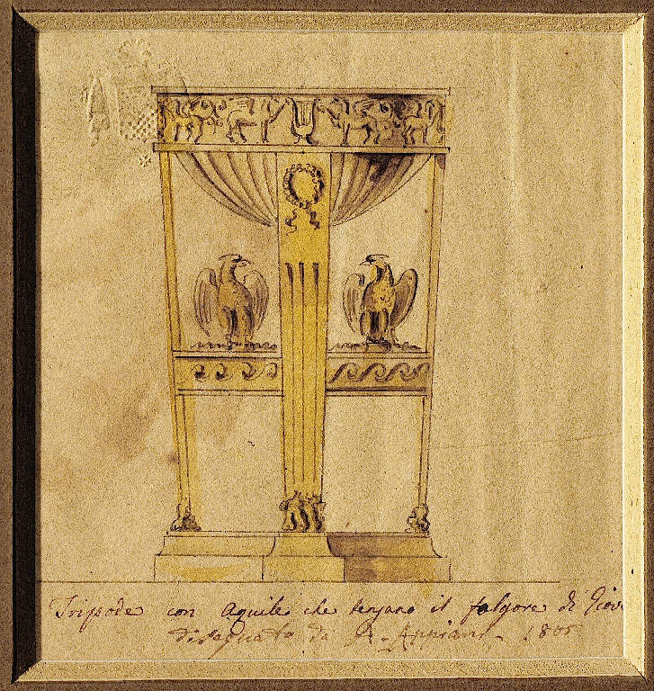 - NOTIZIE STORICO CRITICHE Il disegno, come ricorda un breve appunto che Riccardo Lampugnani ha annotato a matita sul verso della cornicetta, fu regalato al collezionista milanese da Federico Falck la vigilia di Natale del 1986.\nIl timbro a secco posto in alto a sinistra è di notevole interesse: ignoto al repertorio del Lugt, è stato individuato di recente sui disegni della collezione di Umberto Osio e segnala l'antica appartenenza del foglio alla collezione dei duchi Litta Visconti Arese, antica e nobile famiglia milanese che raggiunse l'apice delle sua fortuna durante l'età napoleonica (cfr. G. Fusconi, a cura di, "L'artista e il suo atélier. I disegni dell'acquisizione Osio all'Istituto Nazionale per la Grafica", catalogo della mostra, Roma 2006, p. 206, n. 16).\nLa scritta antica posta nella parte bassa del disegno ricorda, con ogni probabilità, solo l'invenzione di Andrea Appiani per questo tripode ornato di aquile imperiali e di un bassorilievo all'antica sulla fascia che racchiude la coppa: il confronto, infatti, con i disegni che il celebre artista milanese realizzò per l'ebanista Maggiolini e che, con pochi altri, documentano l'attività di Appiani come progettista di arti decorative, non permette di confermare l'attuale attribuzione. Il tratto, nei fogli conservati presso il Gabinetto dei Disegni del Castello Sforzesco (Fondo Maggiolini, MAG. 12. B. 22; MAG. 15. B. 25; MAG. 24. B.14; MAG. 13. B. 23, si veda anche l'articolo di G. Beretti in "Rassegna di Studi e Notizie", vol. XXII, anno XXV, 1998, pp. 39-92 ) che ho potuto esaminare grazie alla cortesia della dott. Arnalda Dallaj, è lieve e preciso, e l'acquerello delicatamente sfumato: rigido, invece, e impacciato il segno che traccia i contorni del tripode Lampugnani, e pesante la mano che, a larghe campiture, stende il colore. \nNon è impossibile che l'anonimo autore del foglio Lampugnani, certamente lombardo e attivo all'inizio del XIX secolo, riprenda qui, per memoria, un progetto pensato da Appiani per la corte imperiale: l'anno che la scritta annota, infatti, il 1805, è di particolare importanza per l'artista lombardo, che riceve la nomina a pittore ufficiale di Napoleone, e a Napoleone alludono tutti gli emblemi che compaiono sul tripode, l'aquila con il folgore, la lira, la corona d'alloro. Nel 1805, inoltre, l'imperatore francese celebra a Milano la propria incoronazione a re d'Italia. Si potrebbe pensare, quindi, che il tripode disegnato da Appiani facesse parte dell'apparato predisposto per la cerimonia, anche se questa ipotesi, per ora, non è confermata da alcuna prova: ma non è forse un caso che il foglio Lampugnani rechi il timbro di collezione della famiglia Litta Visconti Arese, e che Antonio Litta, nominato duca per volontà di Napoleone, fosse a fianco dell'imperatore in qualità di gran ciambellano durante le celebrazioni del 1805.