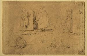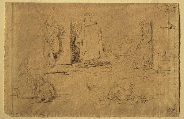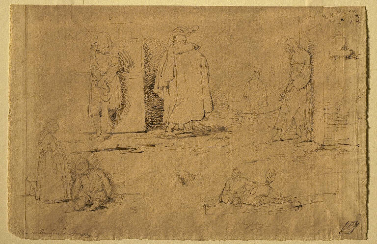 - NOTIZIE STORICO CRITICHE Questo splendido foglio di appunti, rapidamente tracciati a penna con segno elegante e sicuro, apparteneva in origine alla raccolta di Giuseppe Gargantini, ed è giunto nella collezione di Riccardo Lampugnani grazie all'eredità della madre, signora Rita Gargantini Piatti. Sul passepartout, a matita, compare un breve appunto: " Hayez. Figure varie".\nIl disegno, firmato da Francesco Hayez e dedicato alle sorelle Carolina e Caterina Zucchi, è stato esposto alla mostra dedicata alla collezione di Riccardo Lampugnani che il Museo Poldi Pezzoli ha organizzato nel 1997 ("Riccardo Lampugnani: una collezione milanese donata al museo Poldi Pezzoli", Milano 1997, p. 17, n° 3): la breve scheda realizzata in quella occasione appunta l'attenzione soprattutto sul legame, ben noto, che unì per lunghi anni Hayez e Carolina Zucchi, sua modella e amante, e non si addentra in tentativi di analisi stilistica o di proposte di datazione.\nA mio avviso, il foglio della collezione Lampugnani è da accostare agli altri che Francesco Hayez eseguì al tempo del suo impegno per la prima edizione illustrata dei "Promessi Sposi", tra il 1838 e il 1839: si veda, in particolare, lo studio a matita con l'abbozzo di due scene del romanzo, l'incontro tra Don Abbondio e i bravi, e il colloquio tra Don Abbondio e l'Innominato, assai simile a questo per il tratto sintetico che velocemente fissa i contorni delle figure, e i dettagli d'architettura pensati per il fondo delle scene (Milano, Accademia di Belle Arti di Brera, Album Grande II, n. 24/339; cfr. F. Mazzocca "L'Officina dei Promessi Sposi", catalogo della mostra, Milano 1985, p. 134, cat. 191; ringrazio Stefano Bosi per il prezioso suggerimento). Francesco Hayez, però, al progetto per le illlustrazioni dei "Promessi Sposi" rinunciò quasi subito: di quel tentativo restano, appunto, alcuni rapidi schizzi, tutti conservati presso l'Accademia di Brera, e due prove di stampa, mai utilizzate (Milano, Biblioteca Nazionale Braidense, Manz. XXX.9; cfr Mazzocca 1985 cit.). Non conosciamo esattamente i motivi della rinuncia di Hayez: forse l'artista veneziano capì di non essere adatto al compito di illustratore puro che Alessandro Manzoni gli chiedeva; furono poi contattati Louis Boulanger e Achille Devéria, che declinarono l'invito; e infine, per il tramite di Massimo D'Azeglio, che ben lo conosceva, si pensò a Francesco Gonin, pittore storico di buona fama ma soprattutto abilissimo vignettista. Gonin accettò l'incarico; e nel 1840 l'edizione definitiva dei "Promessi Sposi", ornata delle piccole scene vivaci dell'artista torinese, era finalmente pronta.