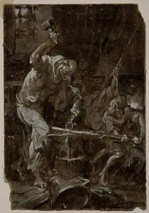 - NOTIZIE STORICO CRITICHE Sulla cornicetta in cui era inserito il foglio, Riccardo Lampugnani ha annotato un breve appunto: "Meraviglioso! Capolavoro di Magnasco. Geiger 1958. Col pendant". Una foto del disegno (negativo 23686), non datata, è conservata nell'album Lampugnani "Foto Dis. 2"; un'altra copia della stessa foto è inserita nell'album D.8: accanto a questa, il collezionista milanese scrive una nota che accenna ad una corrispondenza tenuta con Benno Geiger a proposito di questo bozzetto e del suo compagno, e ad un articolo dello studioso dedicato alle due operette della collezione Lampugnani, mai pubblicato però dalla rivista "Emporium", a cui era destinato. La morte di Geiger, in seguito, chiuse definitivamente la vicenda.\nA mio avviso, la qualità non alta di questo bozzetto non consente di confermare l'attribuzione al grande artista genovese: potrebbe trattarsi, piuttosto, dell'opera di un discreto imitatore, certamente settecentesco, che lavora "à la manière de" con una certa abilità, ma senza l'intensa forza espressiva che caratterizza i lavori sicuri di Alessandro Magnasco.