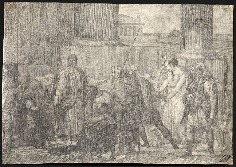 - NOTIZIE STORICO CRITICHE Sul cartoncino di supporto, una nota di Riccardo Lampugnani riferisce questo interessante foglio a Roberto o Alessandro Focosi: ma il confronto con i disegni noti di Roberto Focosi, incisore milanese di una certa notorietà, esclude, a mio avviso questa ipotesi (cfr D. Falchetti Pezzoli "Una raccolta di 174 disegni ottocenteschi realizzati da Roberto Focosi a altri visti in rapporto alle incisioni derivate", in "Rassegna di Studi e Notizie", vol. XVI, anno XVI, 1991-92, pp. 97-171). Quanto ad Alessandro, figlio di Roberto Focosi, le date della sua attività sono troppo avanzate per questo foglio, che rivela una sensibilità sqquisitamente neoclassica. Il disegno Lampugnani sembra invece assai vicino, per la complessa scena architettonica, per la gestualità enfatica dei personaggi, e per la minuzia quasi cesellata con cui sono definti i particolari, ad alcuni fogli di Luigi Ademollo, pittore e incisore di origine milanese, ma a lungo attivo a Firenze e a Roma: si veda, in particolare il modelletto con la "Moglie di Asdrubale che rimprovera il marito per essersi arreso a Scipione" (Firenze, Uffizi; cfr. C. Sisi, a cura di, "Disegni dell'Ottocento dela collezione Batelli", Firenze 1987, pp. 32-35), assai simile, nel tono teatrale, al "Cristo e l'adultera" della raccolta Lampugnani. Il foglio è, con ogni probabilità, preparatorio per una incisione, finora non rintracciata.