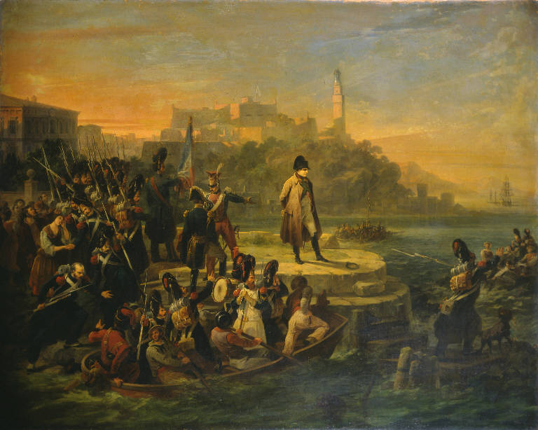 - NOTIZIE STORICO CRITICHE Il dipinto è stato esposto alla mostra dedicata alla collezione di Riccardo Lampugnani che il Museo Poldi Pezzoli ha organizzato nel 1997 ("Riccardo Lampugnani: una collezione milanese donata al Museo Poldi Pezzoli", Milano 1997, p. 17, n° 1).\nNulla sappiamo della storia di questo interessante quadro di tema napoleonico, e non sappiamo esattamente come e quando sia entrato a far parte della raccolta dell'ingegnere milanese.\nGiovanni Servi, veneziano d'origine, fu pittore di buona fama nella Milano del XIX secolo: nel 1839 ricevette la nomina a "professore aggiunto" alla cattedra di elementi di figura, carica che mantenne fino al 1847 (M.C. Gozzoli in "Mostra dei Maestri di Brera", Milano 1975, pp. 154-155); ebbe rapporti con i committenti più importanti di quegli anni, Francesco Peloso, Francesco Arese, Vitaliano Borromeo, Ambrogio Uboldo (Gozzoli 1975 cit, e C. Rovida, in "Album: Esposizione di Belle Arti i Milano", Milano 1839, pp. 59-60); e soprattutto Enrico Mylius, di cui fu consigliere artistico dal 1841, l'anno della morte del pittore Gaetano Cattaneo, che lo aveva preceduto nell'incarico. A Mylius, ricco banchiere e industriale di origine tedesca, Giovanni Servi fu legato non solo per il rapporto professionale, ma anche per una intensa consuetudine privata che è ben documentata dalle lettere frequenti che il pittore e il collezionista si scambiavano (cfr. R. Pavoni, a cura di, "...rispettabilissmo Gothe...caro Hayez...adorato Thorvaldsen...Gusto e cultura europea nelle raccolte d'arte di Enrico Mylius", catalogo della mostra di Milano 1999, ed. Venezia 1999, passim e appendice documentaria).\nIn due occasioni, nel 1841 e nel 1844, Giovanni Servi espone alla mostra annuale dell'Accademia di Brera dipinti di soggetto napoleonico: il primo, "Lo sbarco di Napoleone a Cannes fuggito dall'isola d'Elba", gli era stato commissionato dal conte Stefano Riva ("Album: Esposizione di Belle Arti in Milano", 1841, pp. 83-89, con incisione di Gandini); il secondo, che erroneamente Mazzocca, nel 2002, identifica con il dipinto donato da Riccardo Lampugnani al Museo Poldi Pezzoli (F. Mazzocca in "Riccardo Lampugnani...", 1997, p. 17)F. Mazzocca "Andrea Maffei patrono delle arti e collezionista", in id. "L'ideale classico...", Venezia 2002, p. 639, nota 21), raffigurava "Napoleone a Boulogne sur mer il 14 luglio 1805" ed era stato eseguito per il banchiere Carlo Gaggi ("Gemme d'arti italiane", Milano 1845, pp. 25-38, con incisione di Ripamonti). E' molto probabile che il "Napoleone in partenza dall'isola d'Elba per l'impresa dei Cento giorni" della collezione Lampugnani sia stato eseguito nello stesso giro d'anni, forse per un committente privato: di certo, il dipinto non è mai stato esposto alle mostre annuali dell'Accademia di Brera. Fernando Mazzocca, commentando nel 1983 un dipinto di Francesco Hayez, il "Napoleone distribuisce le decorazioni dopo la battaglia di Wagram", del 1831 circa, nota una massiccia e significativa ripresa, in Italia, della iconografia napoleonica all'epoca della Monarchia di Luglio (1830-1848), e in coincidenza con il momento esatto della conquista del potere da parte di Luigi Filippo d'Orléans; al dipinto di Hayez lo studioso accosta alcuni esempi, e cita, in particolare, i due quadri di Giovanni Servi del 1841 e del 1844 (F. Mazzocca in M.C. Gozzoli-F. Mazzocca "Hayez", Milano 1983, pp. 210-211). Il "Napoleone" Lampugnani appartiene con certezza allo stesso clima culturale, come già notava Fernando Mazzocca nelle breve scheda che, nel 1997, accompagnava la prima esposizione del dipinto (Mazzocca, in "Riccardo Lampugnani..." 1997, cit., p. 17).
