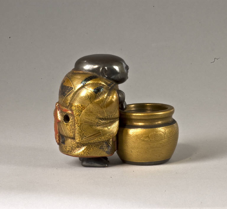 Okimono decorato in lacca grigia, rossa e oro, raffigurante un bambino in piedi, con la mano sinistra posata sull'orlo di un grande bacile all'interno del quale nuotano due pesci rossi. L'abito del personaggio è ornato con motivi di ventagli rigidi, elementi floreali e spirali di onde. L'esterno della vasca è decorato con onde sulle quali si stagliano tre barche con fasci di erbe e corolle floreali.