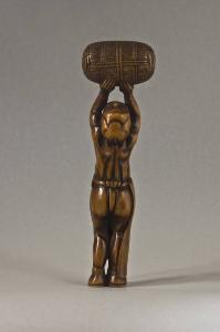Questo netsuke , di notevoli dimensioni, raffigura un uomo a petto nudo e con il ventre prominente mentre allunga le braccia per sollevare una balla di riso; all'altezza della vita è allacciato un grembiule che gli copre il bacino e una sola gamba fino al piede.