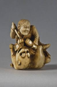 Netsuke raffigurante lo scontro corpo a corpo tra un guerriero, armato di spada corta nella mano destra, e una tigre, sdraiata sul dorso e trattenuta a terra.
