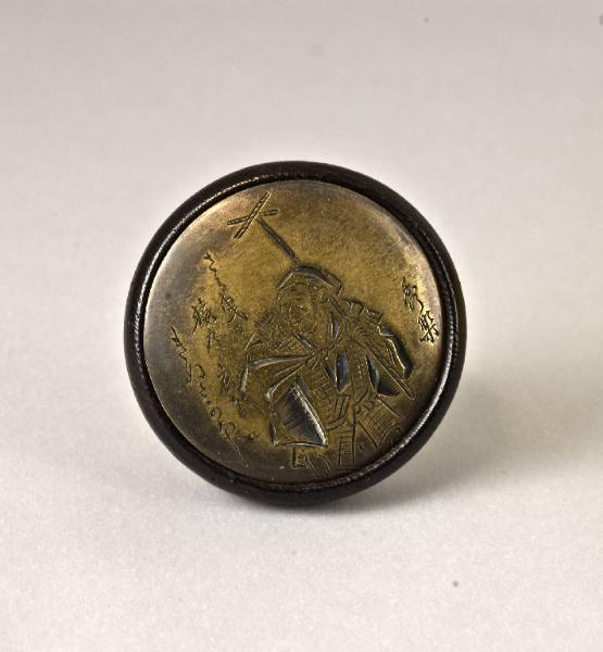 Netsuke di tipo kagamibuta con disco in ebano, sul quale è stata applicata una piastra circolare in metallo lavorata con shibuichi. La decorazione incisa raffigura un ammaestratore di scimmie (sarumawashi) in cammino, sulle cui spalle si arrampica la fedele scimmietta (saru).