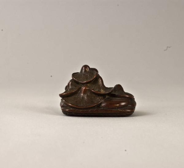 Questo netsuke raffigura una composizione con alcuni funghi uno sull'altro, tutti posati su una stuoia di paglia intrecciata.