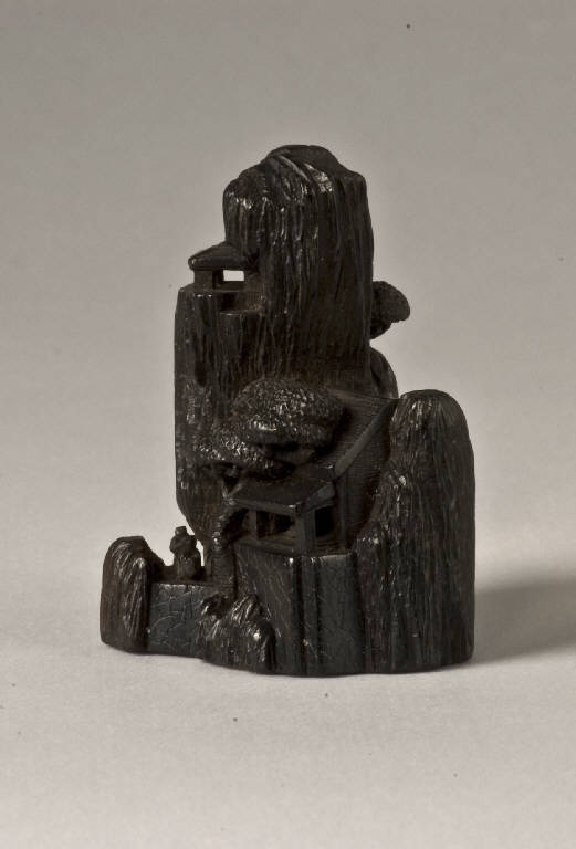 Netsuke raffigurante uno scorcio di paesaggio, con una serie di rocce di diverse altezze sulle quali si abbarbicano padiglioni e alberi di pino (matsu).