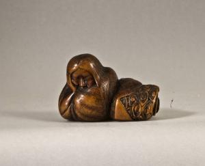 Netsuke raffigurante uno shojo addormentato sul fianco destro, con la testa sorretta dalla mano destra. Ha i capelli molto lunghi e indossa braghe con ornati di onde e una casacca (haori) decorata con un motivo di losanghe.