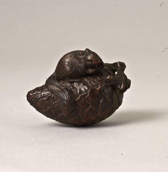 Il netsuke raffigura un roditore dalla coda lunga posato su una pigna.