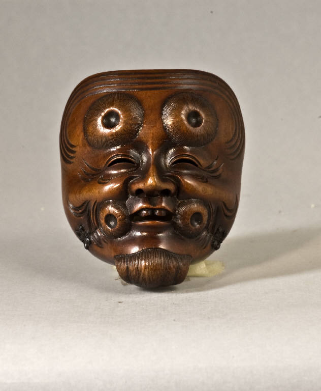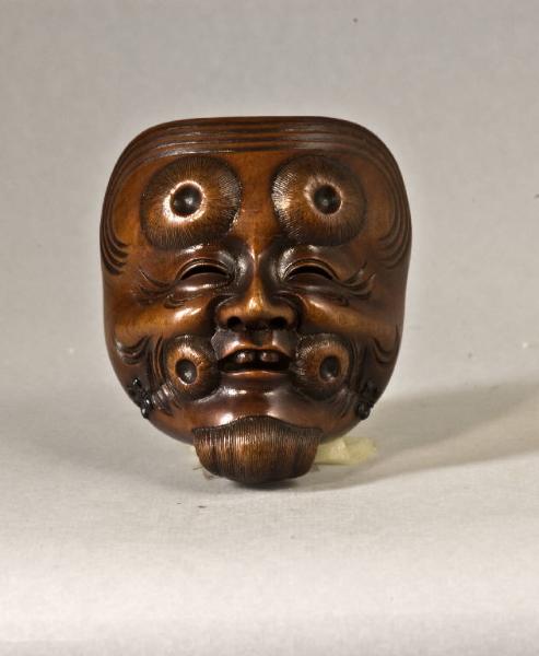 Il netsuke raffigura una maschera (men) di Okina, riconoscibile per i caratteristici ciuffi di peli agli angoli della bocca, il pizzetto e le ciocche di capelli sulla fronte.