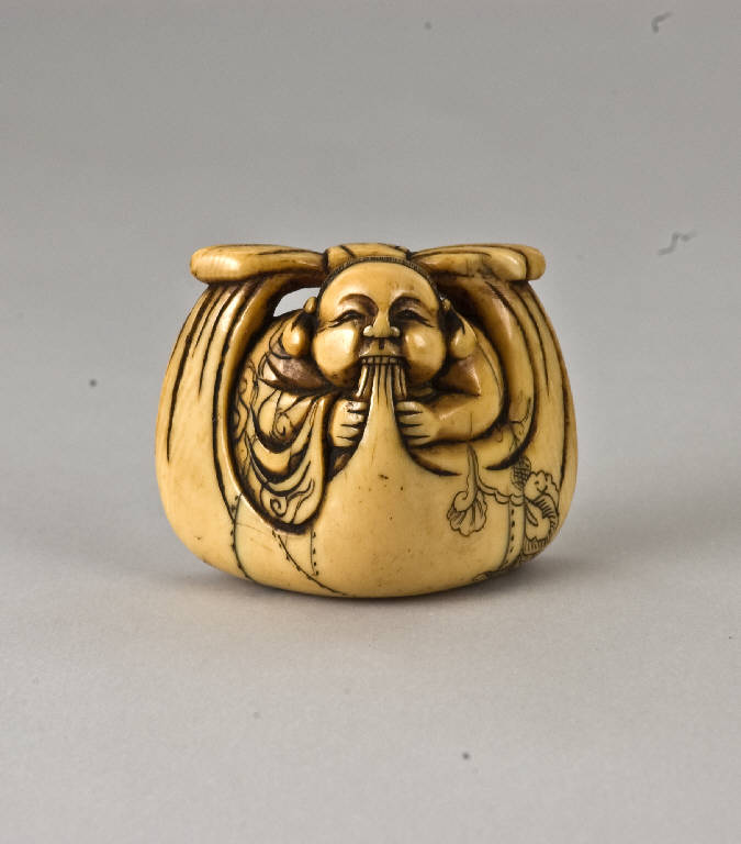 In questo netsuke Hotei è raffigurato con il suo sacco avvolto come fosse un abito (furoshiki), mentre con i denti trattiene un lembo del tessuto. La divinità mostra le sue caratteristiche fisiche più usuali: grande stazza, testa rasata coperta da un cappello a calotta, e lobi delle orecchie allungati.