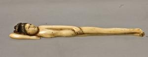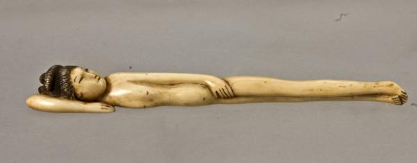 - NOTIZIE STORICO CRITICHE Un simile tipo di sculturina, di origine cinese, era utilizzata sul continente dalle donne per indicare al medico dove sentivano dolore evitando così di mostrargli parti sconvenienti: sono perciò note con la definizione di "dama del medico". Simili opere cinesi, importate in Giappone attraverso il porto di Nagasaki, venivano nell'arcipelago adattate alla funzione di netsuke semplicemente ricavando i due fori dell'himotoshi, solitamente sul retro della composizione. In questo esemplare, tuttavia, sembra che l'intaglio sia stato eseguito nell'arcipelago, probabilmenet nella prima metà dell'Ottocento. La Jirka-Schmitz nota delle affinità compositive tra questo tipo di figura e il pezzo con Oni sdraiato della collezione Trumpf di Stoccarda (Netsuke 2008) il quale potrebbe essere interpretato come una parodia giapponese della cosiddetta "dama del medico".