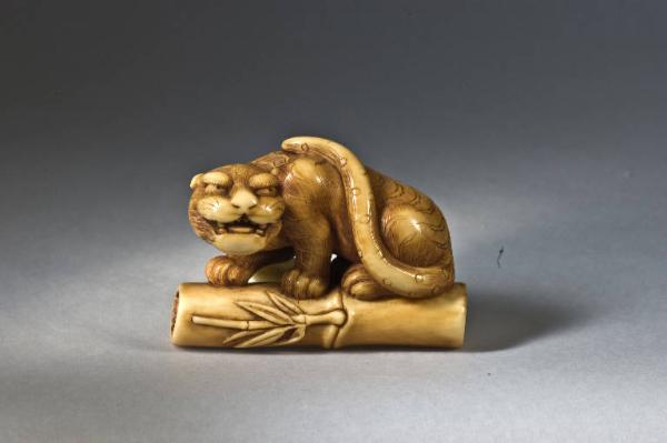 - NOTIZIE STORICO CRITICHE Gli artisti giapponesi raffiguravano la tigre basandosi prevalentemente su dipinti cinesi o loro copie realizzate in Giappone; in molti casi quindi le immagini dell'animale risultano caricaturali e poco realistiche. Spesso, come in questo esemplare, le tigri sono raffigurate insieme al bambù.\nLa composizione che caratterizza questo netsuke, abbastanza diffusa nell'ambito dell'arte del netsuke, sembra ispirarsi ad analoghi lavori di Tomotada, uno tra i maggiori intagliatori di netsuke attivi a Kyoto nel XVIII secolo.