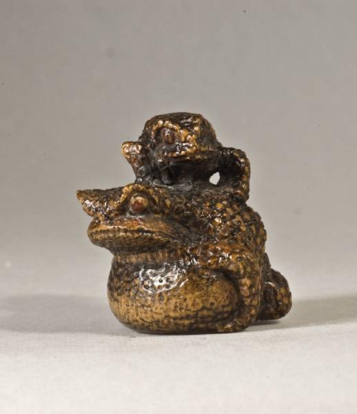 La composizione raffigura un rospo più grande, probabilmente una femmina, sul dorso del quale si posa un altro rospo di minori dimensioni, forse un maschio. La scabrosità naturale della pelle di questo animale è resa attraverso un intaglio minuzioso di minuscoli tasselli in rilievo.