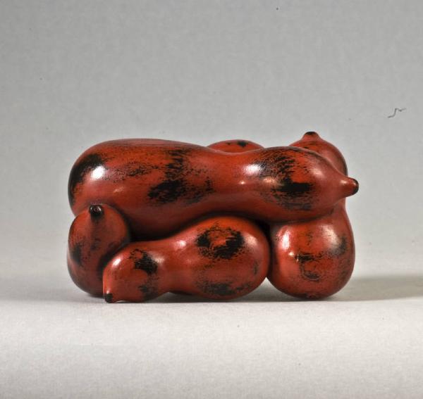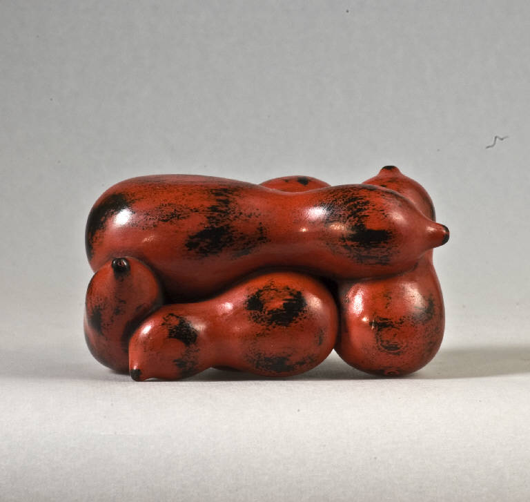 Netsuke in legno laccato raffigurante sei zucche disposte una sull'altra; il laccio passo atraverso due strette aperture ricavate tra le zucche.