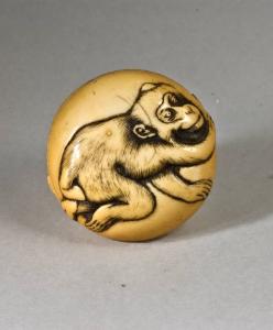 Questo esemplare è un netsuke di tipo manju, raffigurante sulla faccia a vista una scimmia con le zampe posteriori rannicchiate; delle due anteriori, quella sinistra è usata dall'animale per sorreggersi, quella destra è puntata in avanti.