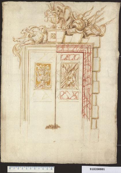 - NOTIZIE STORICO CRITICHE Il disegno si riferisce a due soluzioni decorative per una porta. Il carattere rustico della proposta di destra è sottolineato, oltre che dalla presenza del contorno a bugnato, anche dai trofei militari che decorano l'architrave, al cui centro è collocata una conchiglia con busto femminile. A sinistra, la linearità delle cornici dello stipite è arricchita da una mensola, che funge da elemento di raccordo con l'angioletto adagiato sull'architrave e appoggiato al basamento di un vaso.
