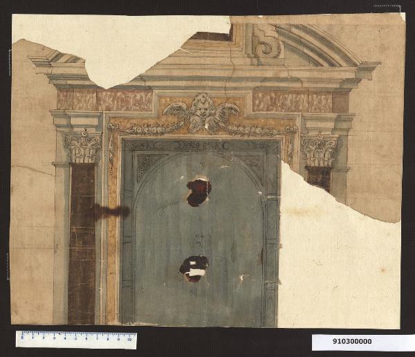 - NOTIZIE STORICO CRITICHE Il foglio raffigura un elegante progetto di un altare delimitato da colonne corinzie. La cornice superiore della pala, decorata con testa di cherubino da cui partono ghirlande e nastri, è sormontata da un frontone curvo spezzato al centro da una finestra.