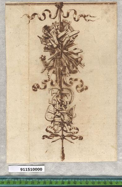 - NOTIZIE STORICO CRITICHE Il presente disegno si riferisce ad un motivo decorativo che, a guisa di trofeo, raccoglie tra due nastri svolazzanti, gli strumenti del disegno e del calcolo geometrico. Come molti altri, a soggetto floreale o geometrico, era stato ideato da Sardini per decorare gli ambienti interni della propria villa a Pieve S. Stefano.