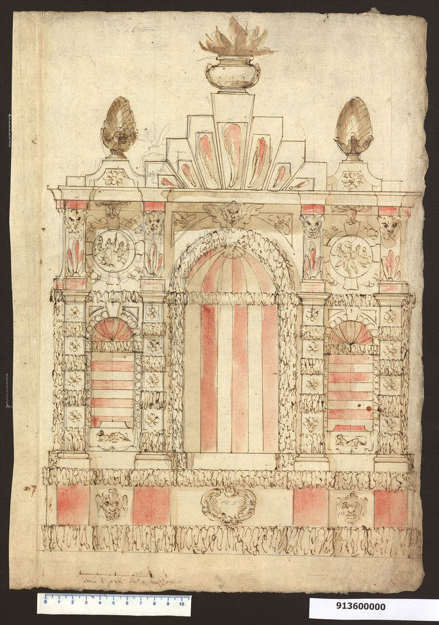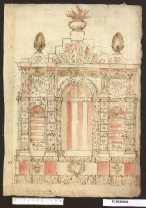- NOTIZIE STORICO CRITICHE Il disegno si riferisce molto probabilmente ad un'architettura per giardino. L'abbondante presenza di rivestimento vegetale degli elementi strutturali, unita a riquadri e tondi con temi ispirati al divertimento e all'ozio fanno pensare, appunto, ad una destinazione per un luogo di svago.