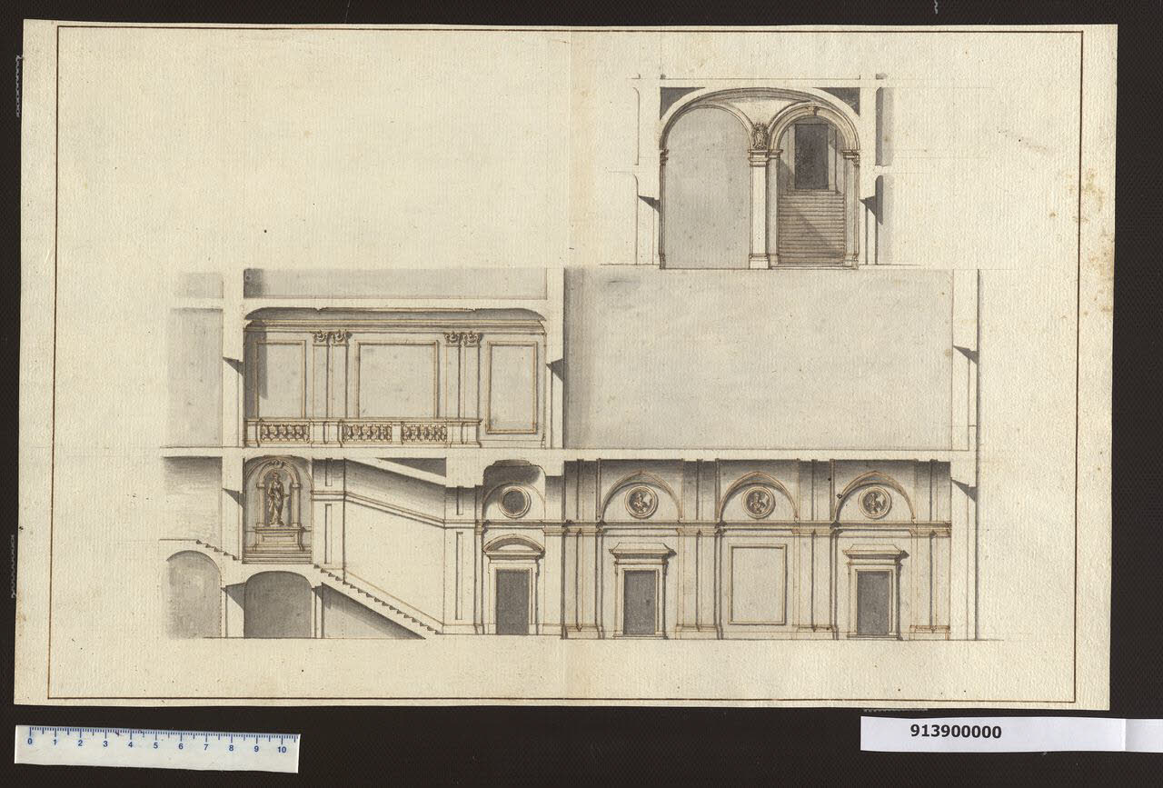 - NOTIZIE STORICO CRITICHE Il disegno è una rappresentazione in sezione del progetto di Domenico Martinelli per un ingresso e uno scalone da inserire in un palazzo esistente in Vienna posseduto dalla famiglia del conte Karl Joseph Paar fin dagli inizi del XVII secolo.\nIl progetto è documentato da una descrizione di Martinelli (Biblioteca Statale di Lucca, ms. 1856 ff. 307 - 308, 140 - 144) e probabilmente si riferisce al suo primo periodo viennese.\nLo scalone è situato al termine del vestibolo, cui si accede dall'ingresso nord del palazzo. Il vestibolo è voltato con un soffitto a botte ribassata, come rappresentato nella sezione trasversale inserita nella parte alta del disegno di sezione longitudinale e il suo spazio è scandito da una serie di lesene e arcate binate ribassate trasversali inframmezzate lungo la parete da archi a tutto sesto tamponati, interrotti da una cornice all'altezza dell'imposta, entro la cui lunetta si trova una serie di tondi decorativi. Nella parte sottostante si trovano in sequenza a partire dall'ingresso una porta incorniciata e sovrastata da un tettuccio a pagoda, una specchiatura, una porta simile alla prima e per ultimo, nel tratto che anticipa lo scalone, una porta sempre incorniciata, ma sovrastata da un timpano curvilineo. Lo scalone si sviluppa in tre rampe a U per un totale di 24 gradini; la prima rampa però prosegue ancora in linea con qualche gradino, dopo il pianerottolo, per raccordarsi al pavimento degli ambienti oltre una porta, dove la doppia altezza impiegata per l'atrio è divisa in due parti per formare un mezzanino. La seconda rampa dello scalone che risvolta è di tre gradini e sulla parete di fondo si trova una statua inserita in una nicchia semicircolare incorniciata e con basamento in rilievo. La terza rampa, che si suppone simile alla prima in quanto è nascosta in sezione dalla parete, conduce al piano nobile dove si trova il salone a doppia altezza parzialmente rappresentato. Al piano di arrivo superiore una balaustra presumibilmente in pietra (o marmo) risvolta a protezione del vano scala. La parete di fondo è decorata con specchiature tra lesene corinzie binate e termina con una cornice su cui sono impostati gli angoli smussati del soffitto.