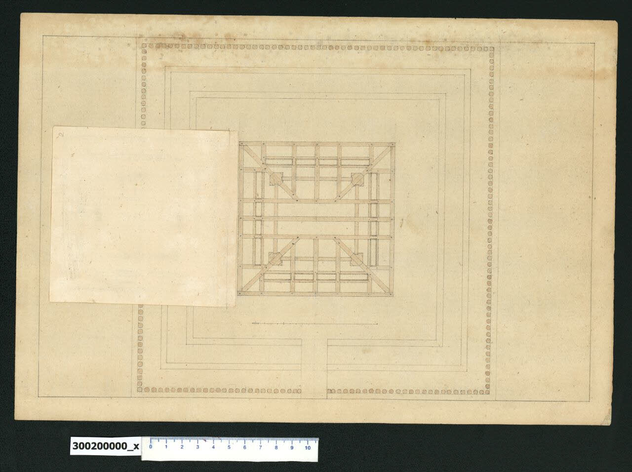 - NOTIZIE STORICO CRITICHE Nell'"Indice" del tomo nel quale era rilegato il disegno viene definito: "Pianta elevazione / e spaccato d'una cataratta".\nIl disegno, che fu erroneamente o volutamente raggruppato dal collezionista e autore dell'indice Giacomo Sardini insieme a quelli propriamente rappresentanti questo soggetto, raffigura in pianta la postazione di avvistamento di cui all'inv. 3,1 (Milano, Collezione Sardini Martinelli) e potrebbe appartenere, seguendo le indicazioni del biografo Giovanni Battista Franceschini in "Memorie della vita di Domenico MartinelIi" del 1772, a una serie di studi su sistemi di fortificazione eseguiti da Domenico Martinelli nel periodo tra il 1694 e il 1698, durante il quale, già residente a Vienna, lavorò anche in Germania e Olanda (Lorenz 1991, pp. 61- 62, 134 -135).\nSi potrebbe trattare quindi della riproduzione di un manufatto da lui visto in uno di questi paesi, da conservare come esempio o da riproporre come modello a qualche committente.\nPer la descrizione generale si veda la scheda del disegno inv. 3,1. La rappresentazione in pianta del manufatto a livello della struttura di sostegno è riportata sul foglio principale, mentre quella a livello del pavimento è su un foglio applicato sovrapposto. La struttura di sostegno è in legno ed è costituita da travetti che si incrociano incastrati e inchiodati tra di loro, in modo da formare un reticolo intorno ai quattro piastrini che sollevano il manufatto dal terreno. Sul foglio applicato è raffigurata la stanza con la stufa d'angolo, cui si accede dal camminamento di ronda esterno, dove sono evidenziate a livello di pavimento delle aperture dotate di sportelli, probabilmente casse per le munizioni.