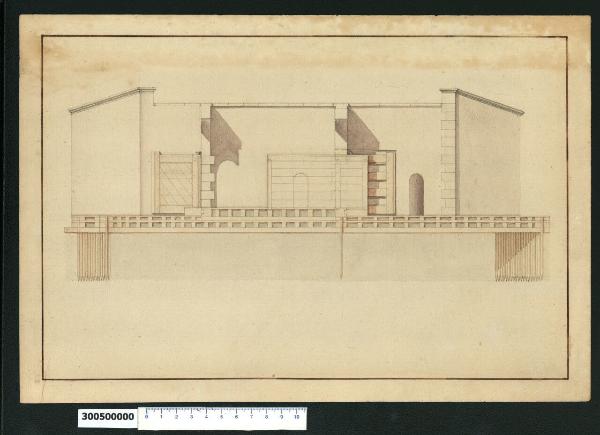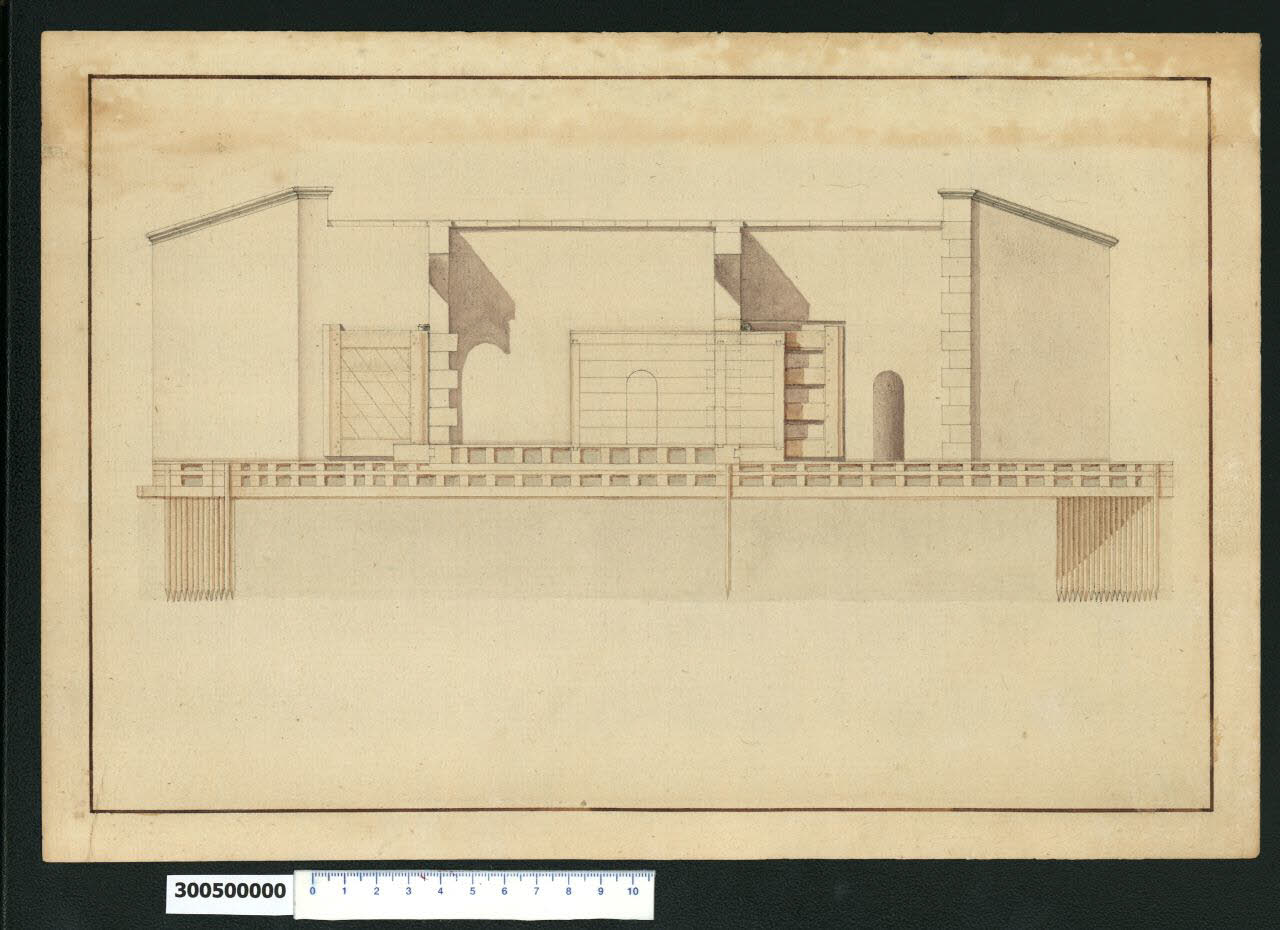 - NOTIZIE STORICO CRITICHE Nell'"Indice" del tomo nel quale era rilegato il disegno viene definito: "(...) spaccato d'una cataratta". \nSi tratta di uno studio relativo a una chiusa (o cataratta), attribuito da Hellmut Lorenz a Domenico Martinelli e rappresenta la sezione longitudinale del manufatto.\nIl disegno è collegato ad altri tre relativi allo stesso soggetto presenti nella Collezione Sardini Martinelli: la rappresentazione delle due fronti alle estremità della chiusa (Milano, Collezione Sardini Martinelli inv. 3,2bis), la pianta della struttura di base (ibidem inv. 3,3) e la pianta che illustra il funzionamento del meccanismo (ibidem inv. 3,5 bis). \nSecondo le indicazioni fornite dalla scala grafica inserita in uno dei disegni citati (inv. 3,3), dovrebbe appartenere alla serie di studi di macchine eseguiti da Martinelli in occasione della sua permanenza in territorio renano (Germania e Olanda) tra il 1694 e il 1698. \nSi potrebbe trattare quindi della riproduzione di un manufatto da lui visto in uno di questi paesi, da conservare come esempio o da riproporre come modello a qualche committente. Non è possibile risalire a una collocazione più precisa sul territorio. \nNel disegno si individuano la sezione della struttura di base che costituisce le fondamenta del manufatto, composta da travetti in legno intrecciati a sostegno delle parti in muratura ed ancorata al terreno attraverso un fitto sistema di palificazioni e delle due arcate in corrispondenza dei portelloni che collegano le parti in muratura che si elevano simmetricamente lungo le due sponde del canale. Il funzionamento del sistema è rilevabile confrontando il disegno con la rappresentazione in pianta (inv. 3,5 bis): i portelloni, chiusi con un'angolatura che attenua la spinta della corrente, si aprono per il passaggio delle barche, mentre ai lati all'interno della muratura delle bocche di deflusso consentono il regolamento del livello dell'acqua.